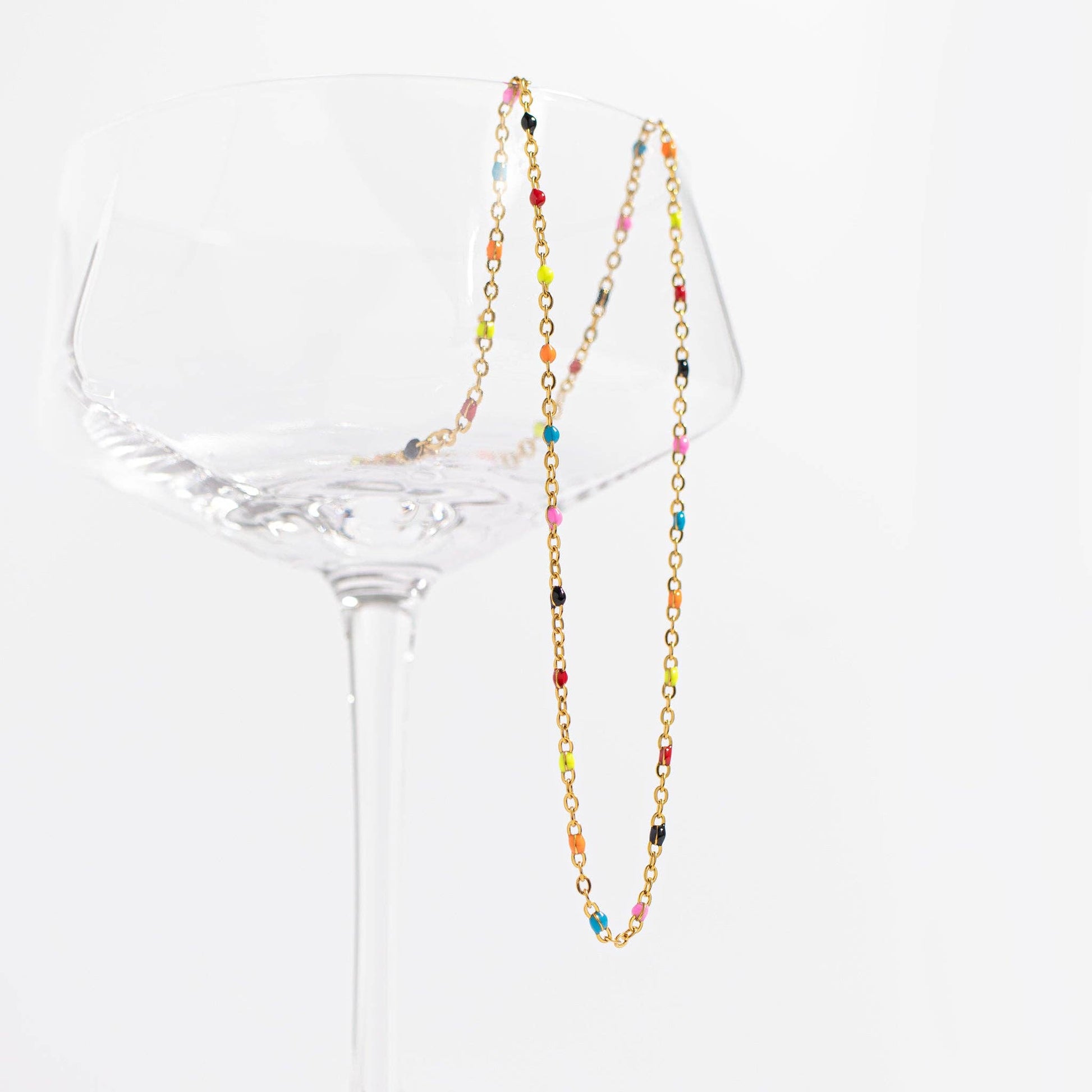 This vibrant necklace combines contemporary design with lasting durability. The 18K gold PVD stainless steel construction resists tarnishing and water damage, while colorful enamel confetti details add visual interest without compromising wearability. Its lightweight construction makes it ideal for layering or wearing as a standalone statement piece. The adjustable chain—available in 16" or 18" with a 2" extension—accommodates various necklines and styling preferences. Hypoallergenic materials ensure comfort for sensitive skin, and the secure lobster clasp provides reliable fastening. Whether you're building a curated jewelry collection or seeking a versatile everyday accent, this necklace delivers both aesthetic appeal and practical longevity.